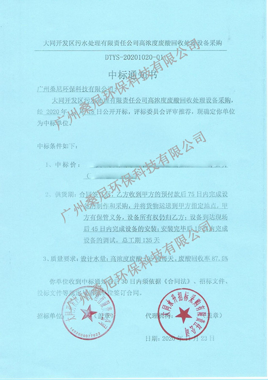 廣州桑尼環保科技有限公司成功中標高濃度廢酸回收處理設備采購項目以良好的信譽、豐富的經驗、強大的技術實力以及專業的方案、合理的報價贏得了招標單位以及評標專家的肯定,成功中標。