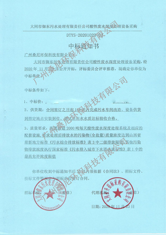 廣州桑尼環保科技有限公司參與酸性廢水深度處理設備采購項目投標,以良好的信譽、豐富的經驗、強大的技術實力以及專業的方案、合理的報價贏得了招標單位以及評標專家的肯定,成功中標。